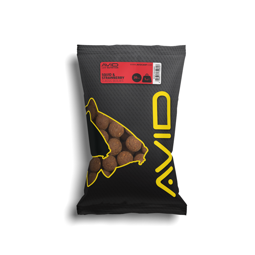 Bouillette de la marque Avid Carp, gamme Classic, saveur Squid & Strawberry, spécial pour la pêche à la carpe.