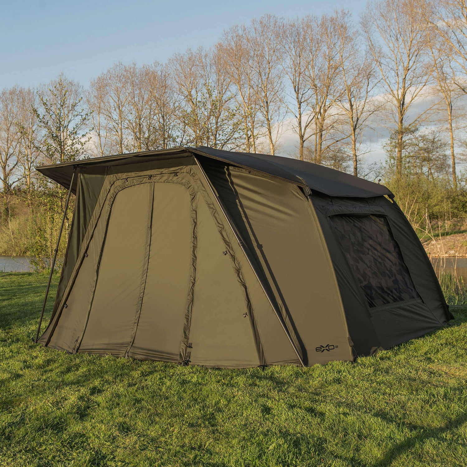 Abri de la marque Avid Carp, modèle Exo 2 personnes, à Couleur kaki, spécial pour la pêche à la carpe.