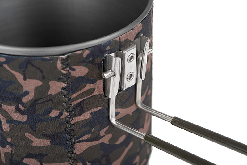 - Comprend un manchon en néoprène de couleur Camo qui peut rester sur la casserole