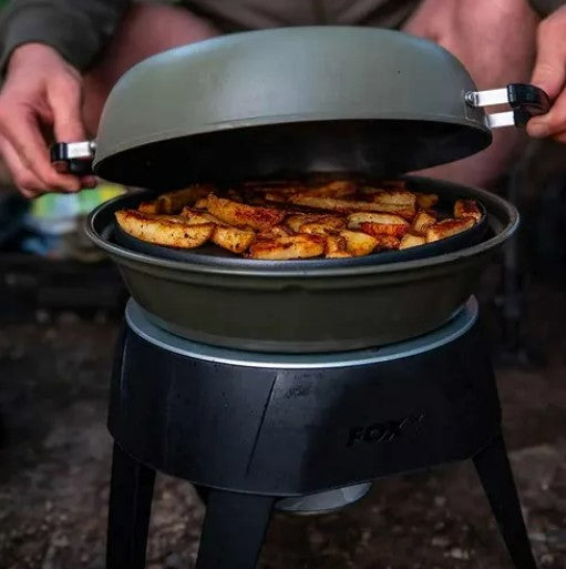 Station de cuisson de marque Fox, idéale pour vos sessions de pêche à la carpe. Avec des ustensiles de cuisine pour assurer la préparation des aliments sur le pouce.