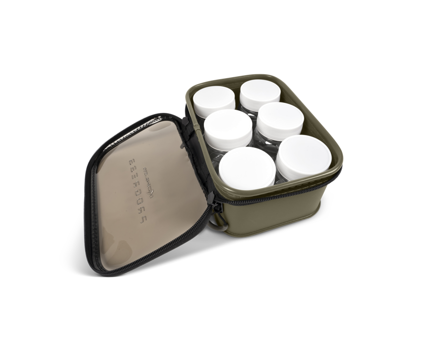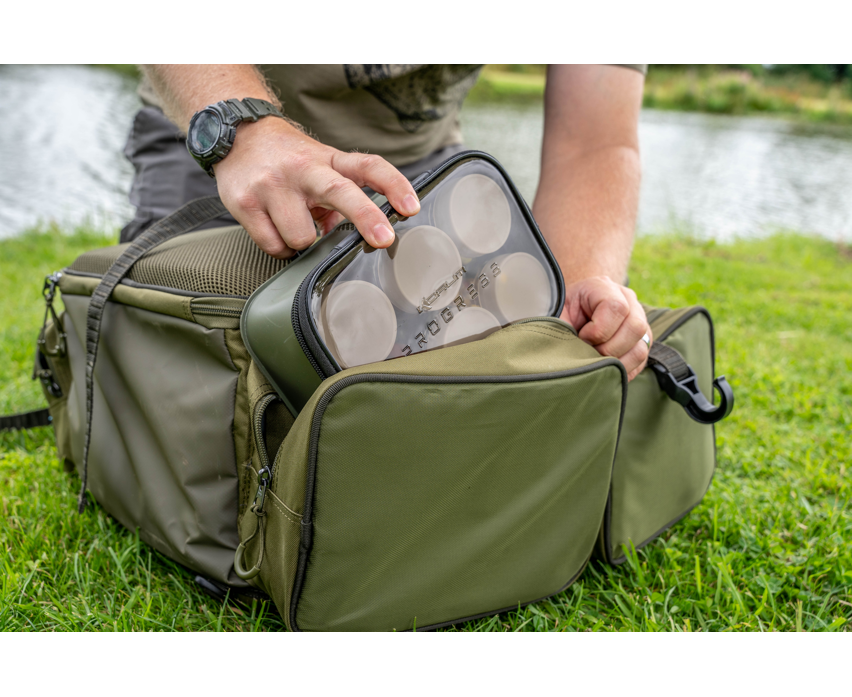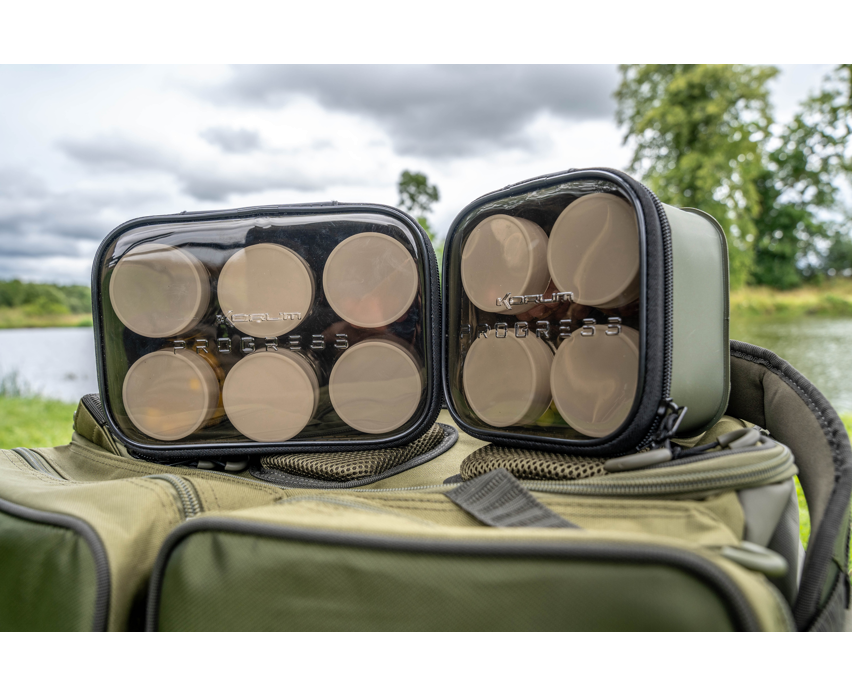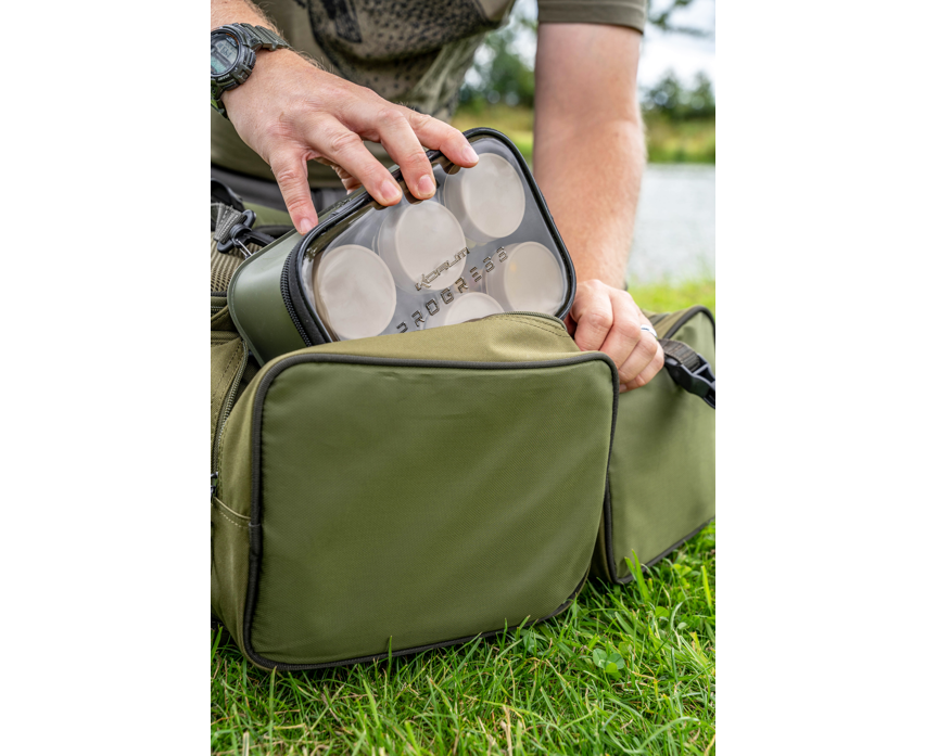 Sac de pêche pour les pots d'appât de la marque Korum, modèle Progress Eva, à Couleur vert, conçu pour le stockage d'appâts, de trempettes et d'autres produits. Liquides.