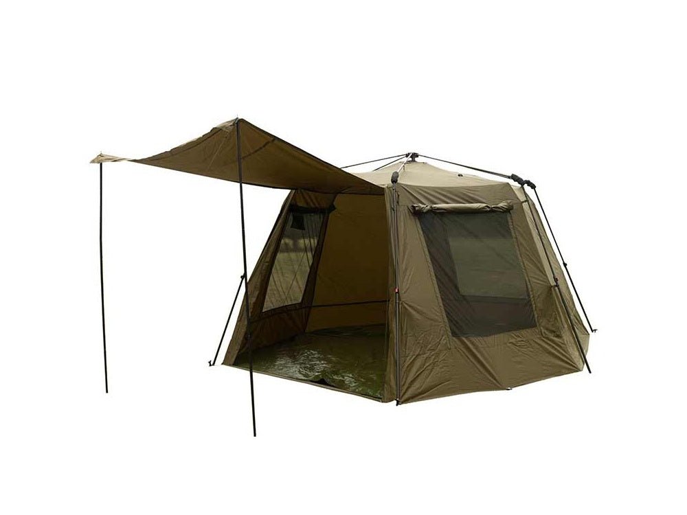 Abri de la marque Fox modèle EOS Abri social XL à Couleur kaki, spécial pour la pêche à la carpe.