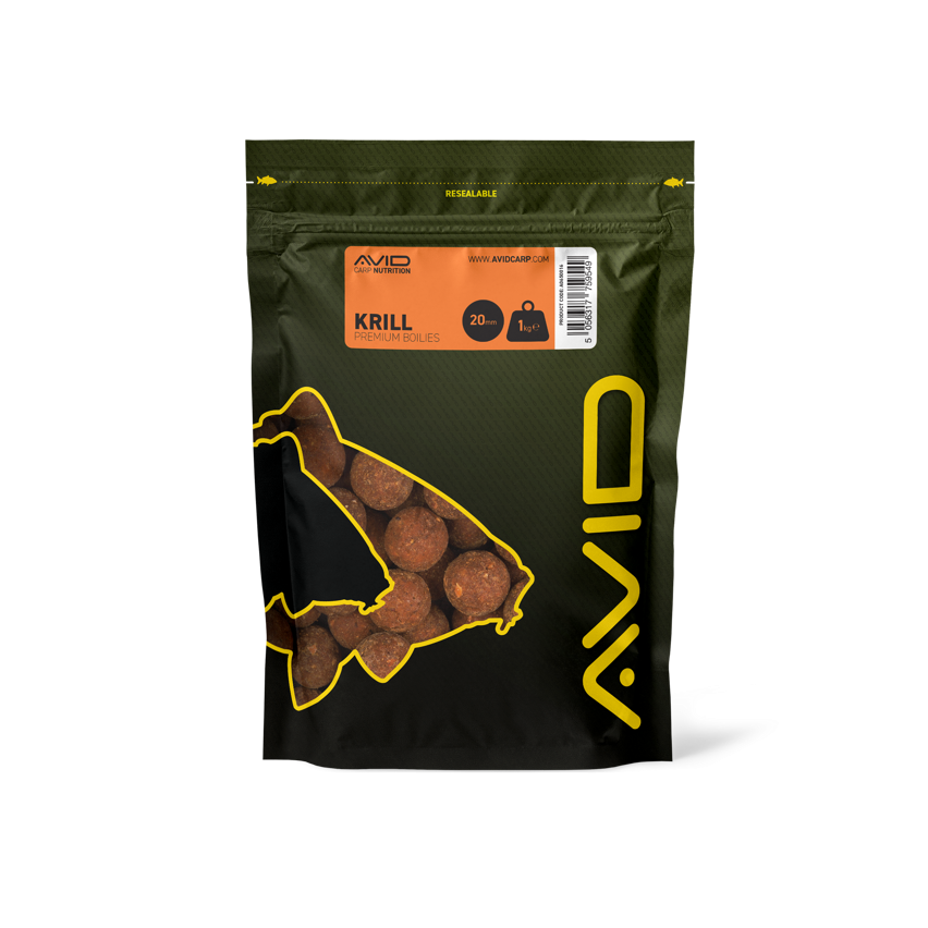 Bouillette de la marque Avid Carp, gamme Premium, saveur Krill, spécialement pour la pêche à la carpe.