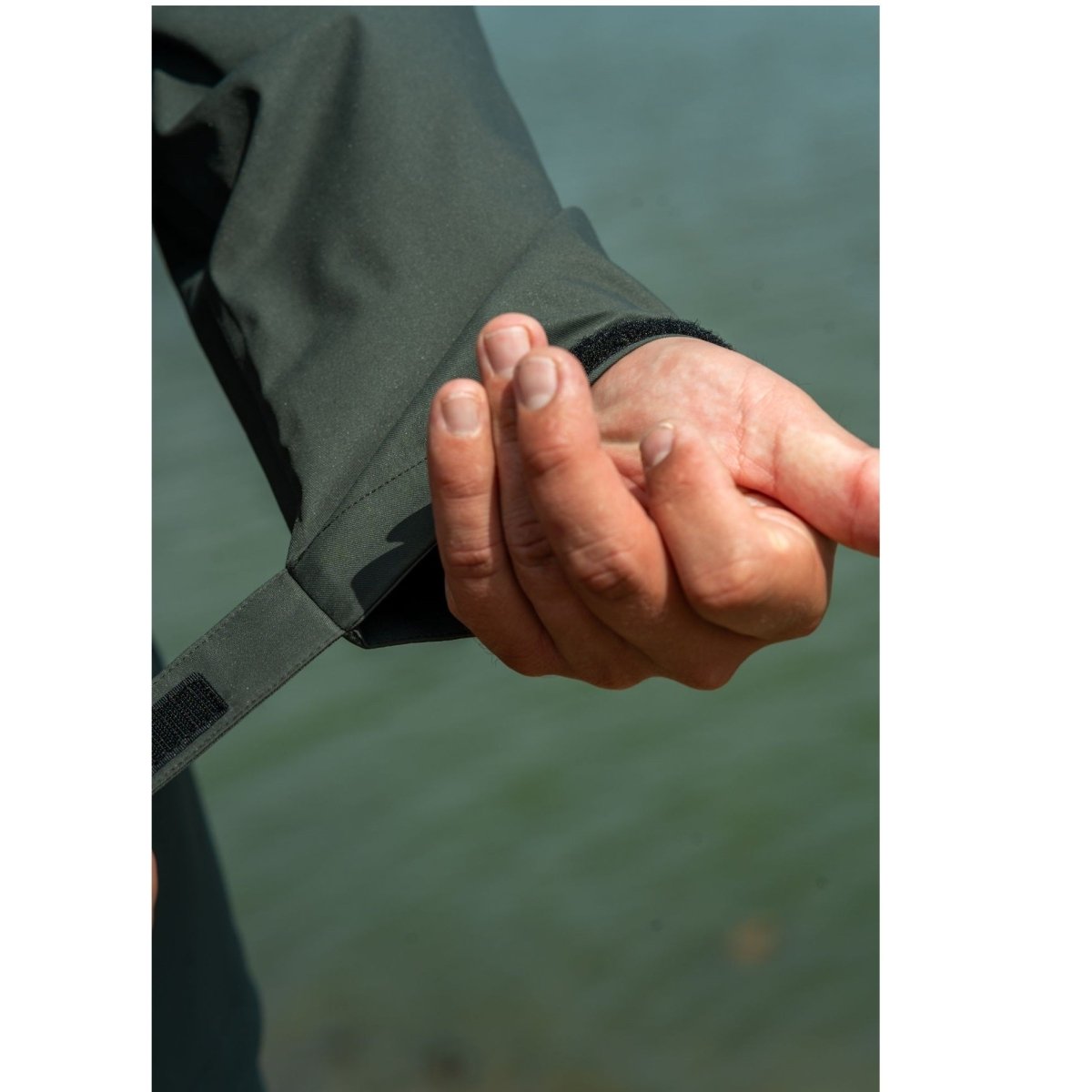 - Les manches sont dotées de poignets angulaires à bandes auto-agrippantes qui évacuent l'eau et nous gardent au sec.