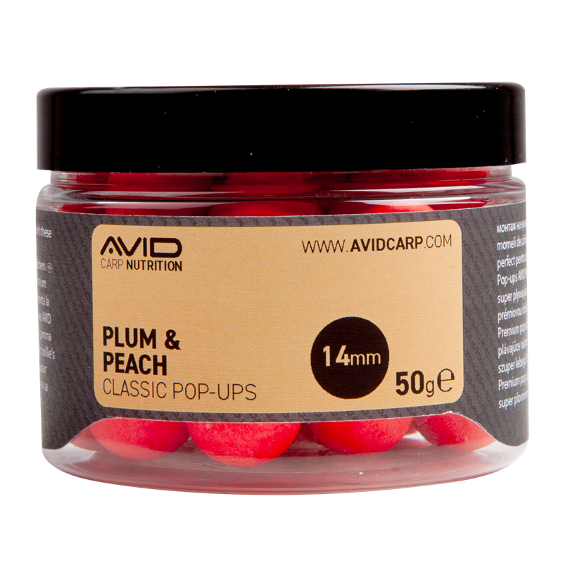 Pop Ups Flotteurs de marque Avid Carp, gamme Classic, goût Prune & Peachspécial pour la pêche à la carpe.