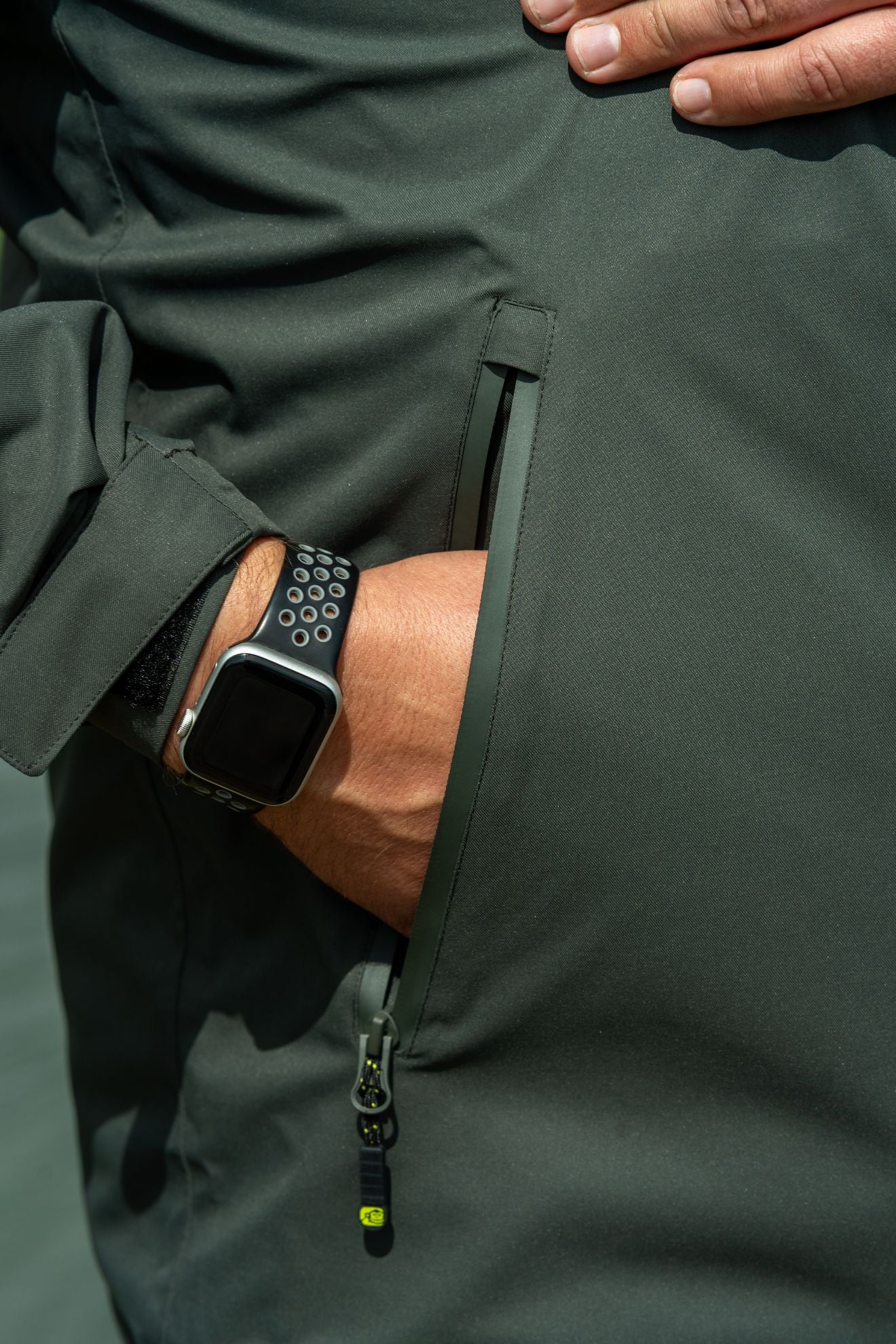 - Les manches sont dotées de poignets angulaires à bandes auto-agrippantes qui évacuent l'eau et nous gardent au sec.