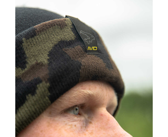 Bonnet Bonnet de marque Avid Carp, à Couleur noir et camouflage, surtout pour la pêche à la carpe.