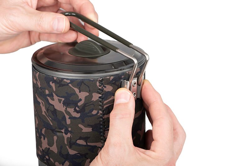 - Comprend un manchon en néoprène de couleur Camo qui peut rester sur la casserole