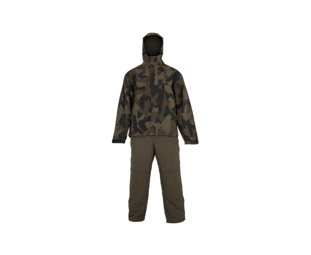 Traje térmico impermeable de la marca Avid Carp, modelo Arctic-Series Distortion, de 2 piezas con diseño en color verde, ideal para tus sesiones de carpfishing.