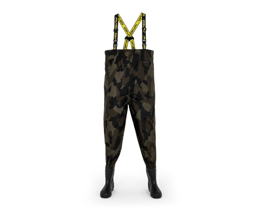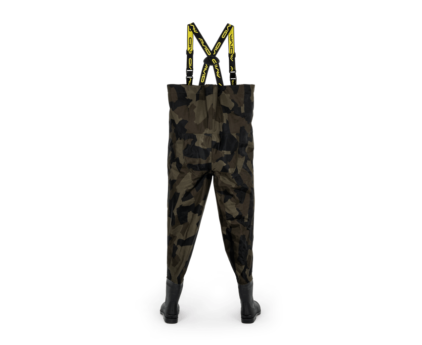 Waders de la marque {{a66bd50019297e5e9c5e7b81e4fedc9}}} modèle {{b381af09fe03ac5590a31a76a76b7827511}}} Active-Line avec un design camouflage foncé, spécialement pour la pêche à la carpe.